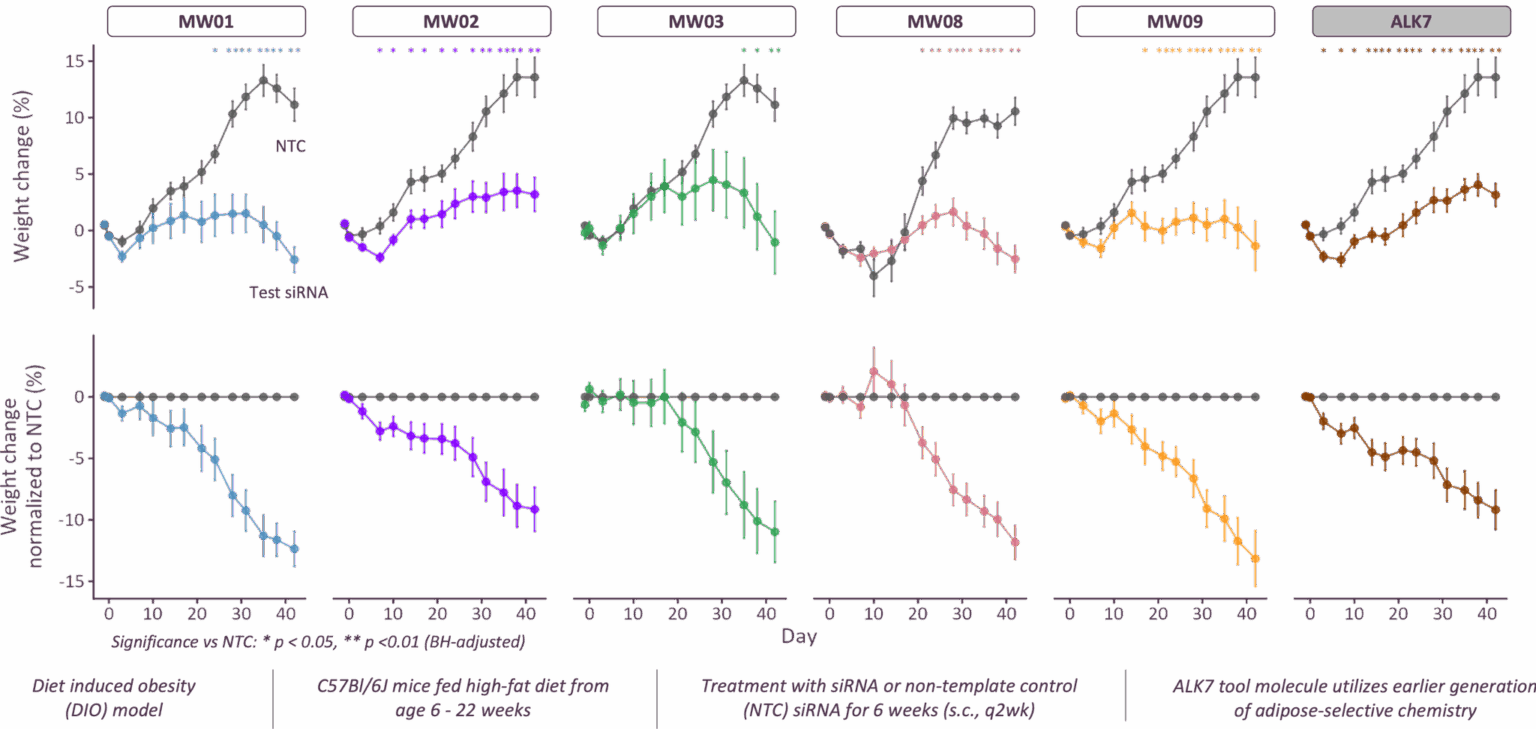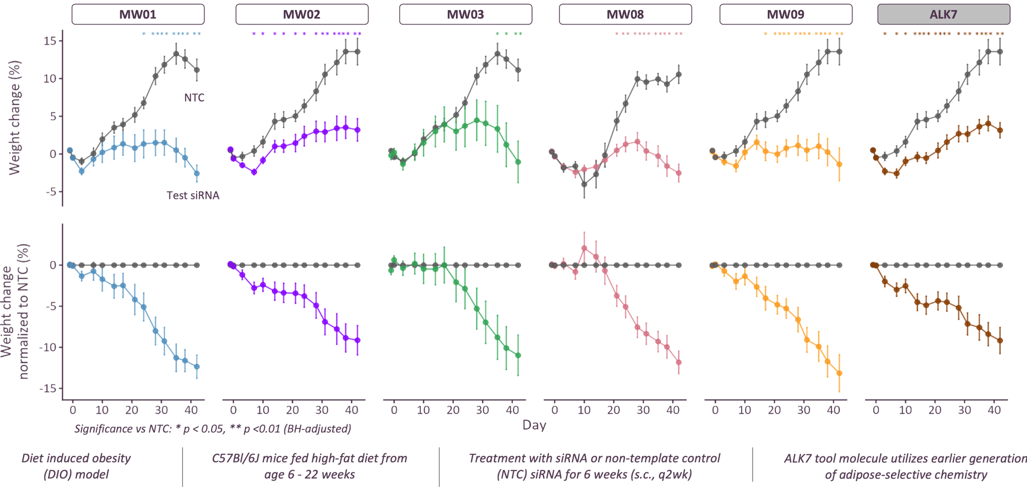 Screening campaigns to identify high-efficiency siRNA sequences to target these genes in rodents. Modification and conjugation of siRNA sequences to mediate adipose-tissue targeting was performed, and adipose-targeted siRNA constructs were tested for in vivo silencing efficacy and therapeutic activity in diet-induced obesity (DIO) models.
